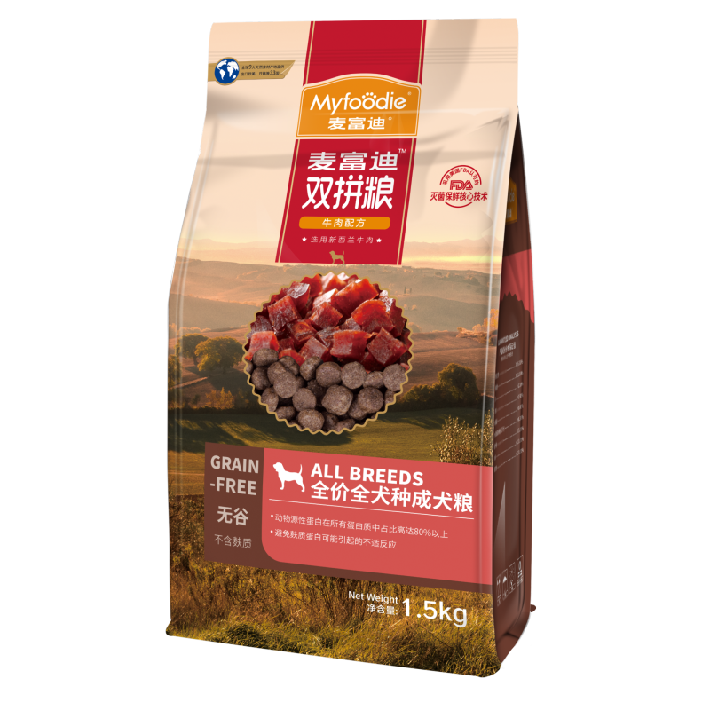 麦富迪采用全球9大天然食材产地直供,出口33个国家,坚持国际标准,国内销售与出口产品坚持“同线同标同质”